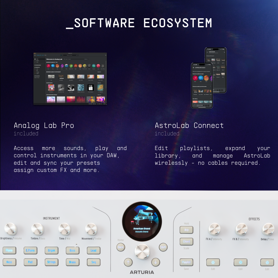 Instrumentet är helt fristående och kräver ingen dator för att fungera. Samtidigt är det en del av ett större ekosystem där Analog Lab Pro och AstroLab Connect ingår, vilket gör det enkelt att synka ljud, skapa presets och organisera live-setups trådlöst. Med sina vocoderfunktioner, avancerade effekter, MIDI/USB/Bluetooth-anslutningar och robust byggkvalitet är AstroLab 37 ett komplett verktyg för dagens keyboardister, producenter och liveartister.