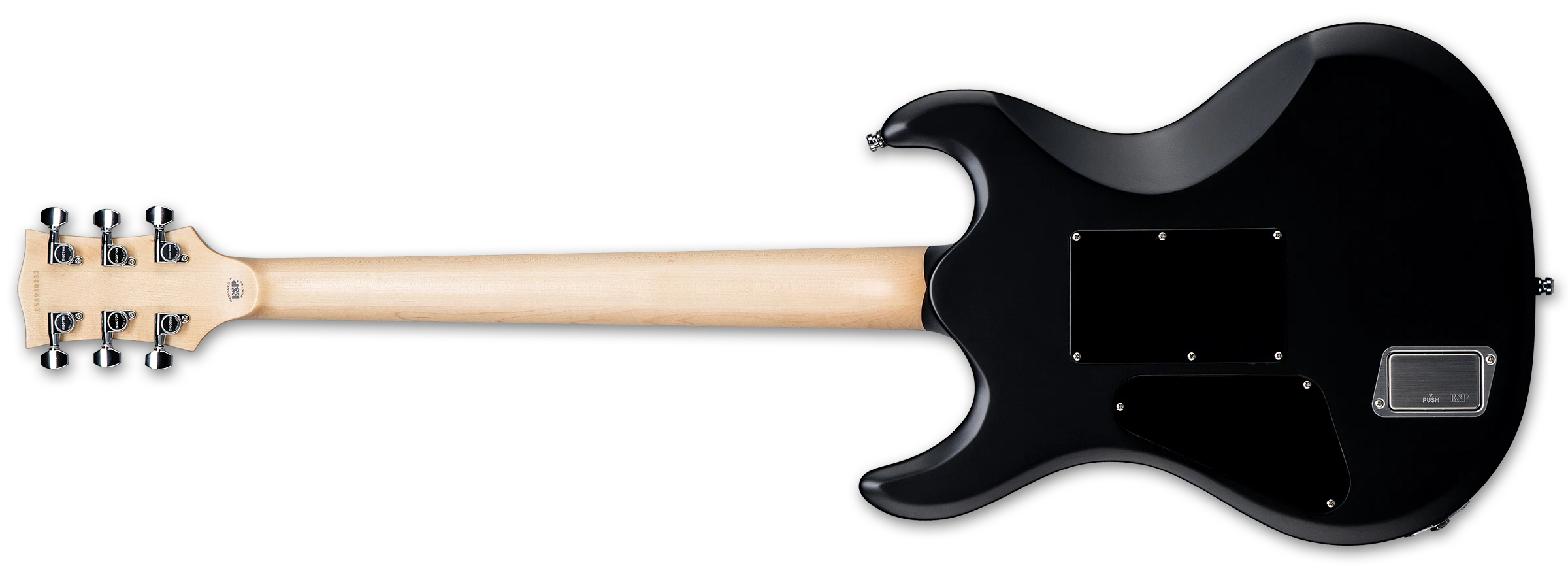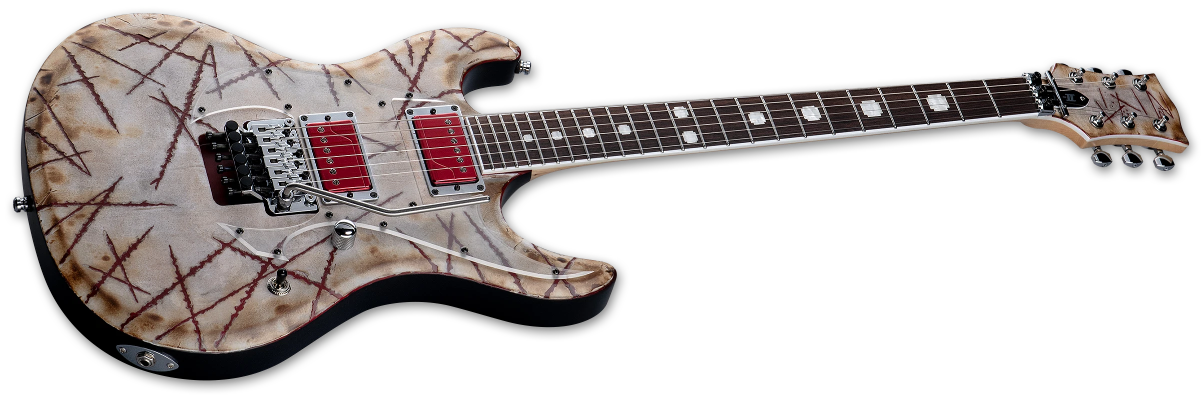 För maximal stabilitet sitter här en Floyd Rose Original svajstall, Gotoh-stämskruvar och ESP Strap Locks. Den aktiva pickupuppsättningen från Fishman är Richard Z:s signaturmodell – en hybrid av alnico (hals) och keramisk (stall) med metallic-röda höljen. Push/pull-funktionen på volymratten aktiverar alternativ voicing för ett ännu bredare ljudspektrum, från skarpa leads till mörka, djupgående rytmer.