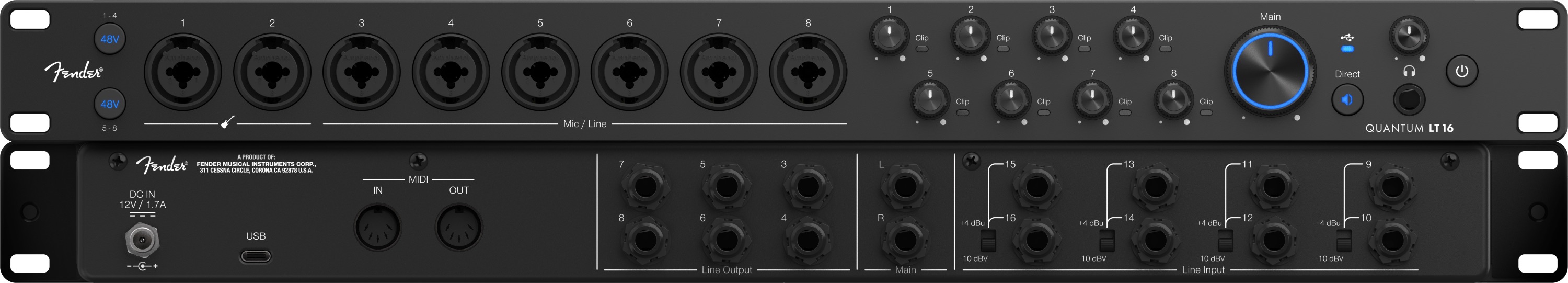 Utöver mikrofoningångarna erbjuder Quantum LT 16 totalt 14 analoga linjeingångar, fördelade mellan frontpanel och baksida. Detta gör det enkelt att integrera externa mikrofonförstärkare, syntar, trummaskiner, mixers och annan linjenivåutrustning utan att behöva kompromissa med signalvägar eller kopplingar. Fender-designade instrumentingångar ger dessutom ett direkt och dynamiskt inspelningsresultat för elgitarr och elbas.