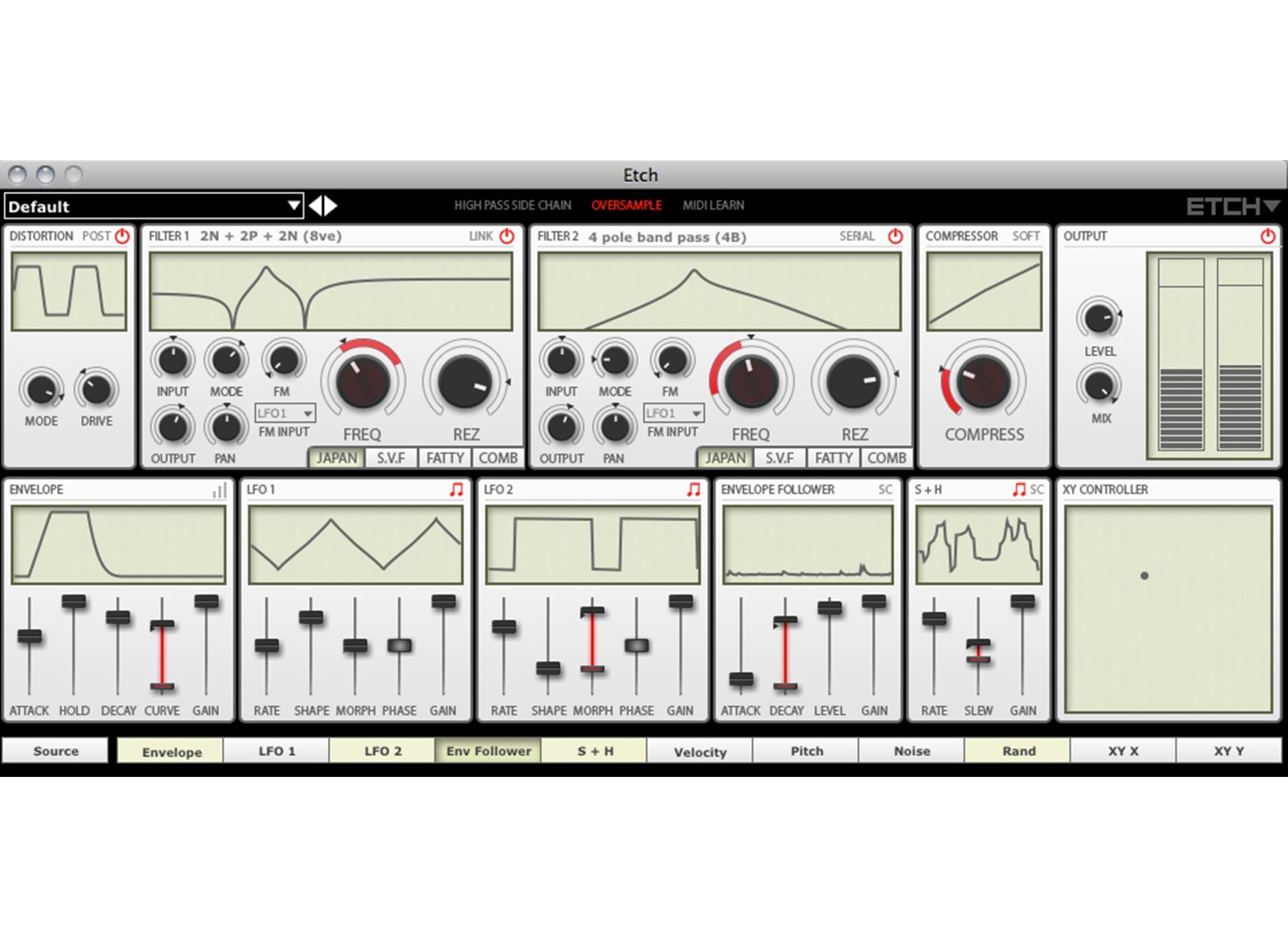 Etch is a versatile dual filtering effect with 4 switchable circuit models, additional distortion, compression and an intuitive, powerful modulation system. Animate Etch's parameters with internal LFOs and other modulators to create exciting, evolving effects. Etch is great for subtle warming, deep sculpting, wild sweeps and experimental sonics.