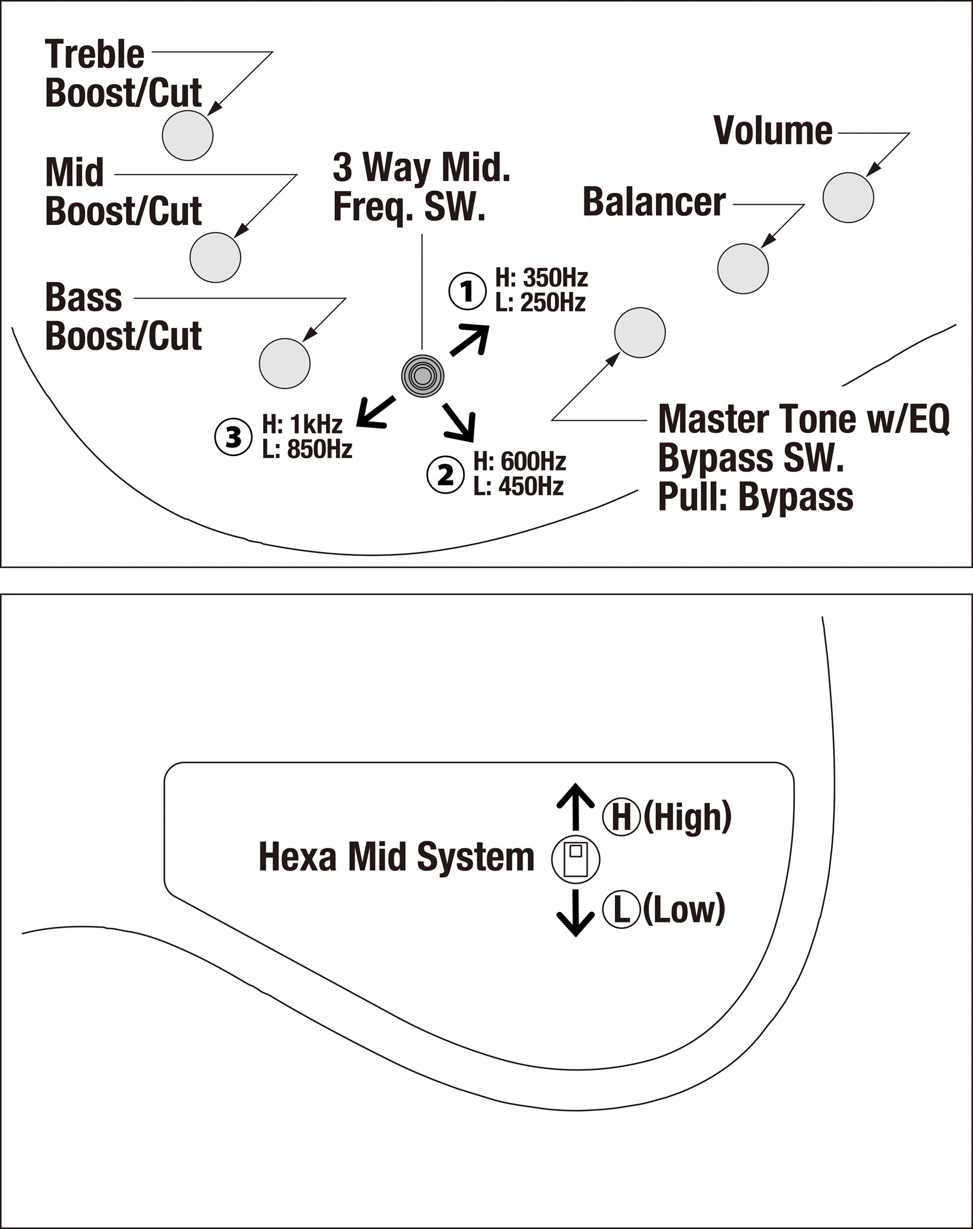 - Elektronik: Aktiv 3-bands EQ med EQ-bypass och Hexa Mid-system