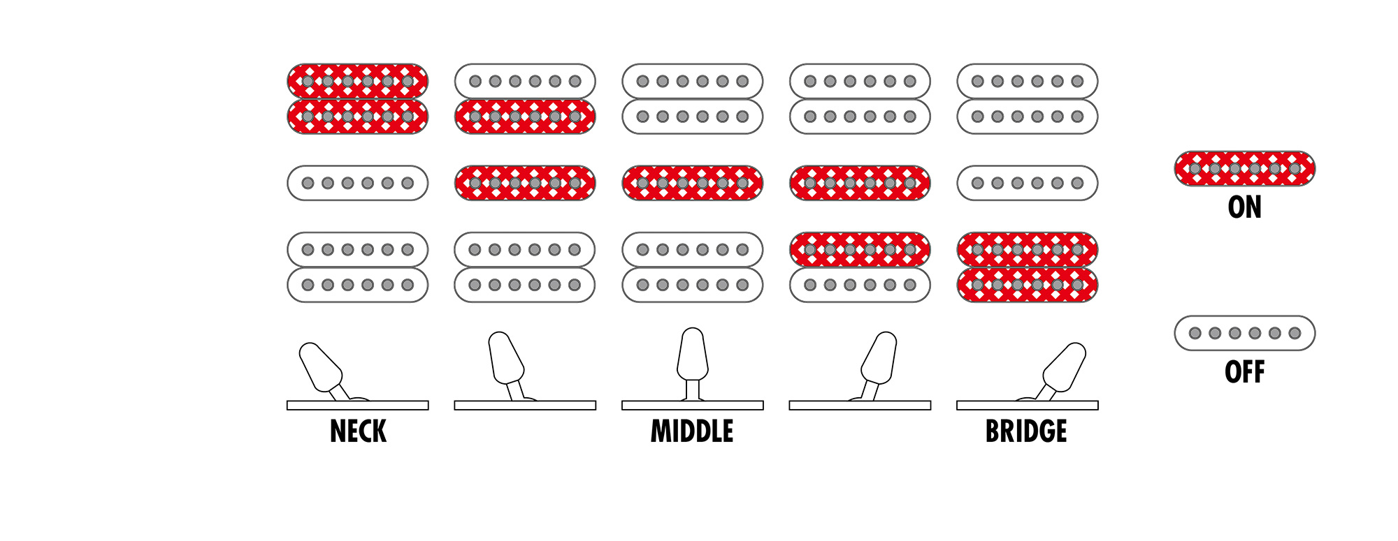 Pickupkonfigurationen i H-S-H-format ger stor tonal bredd, från kraftfulla, fokuserade distljud till klarare och mer dynamiska mellanlägen. Detta gör RG470DXW till ett flexibelt verktyg för allt från modern metal till progressiv rock och tekniskt avancerade genrer.