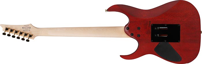 Kroppen är tillverkad i mahogny med en flammig lönntopp, vilket ger både värme och bett i ljudet, medan halsen i tre delar lönn och valnöt med Wizard III-profil erbjuder snabb och exakt spelkänsla. Greppbrädan i jatoba med sharktooth-inlägg och 24 jumbo-band ger en aggressiv men exakt spelupplevelse över hela registret.