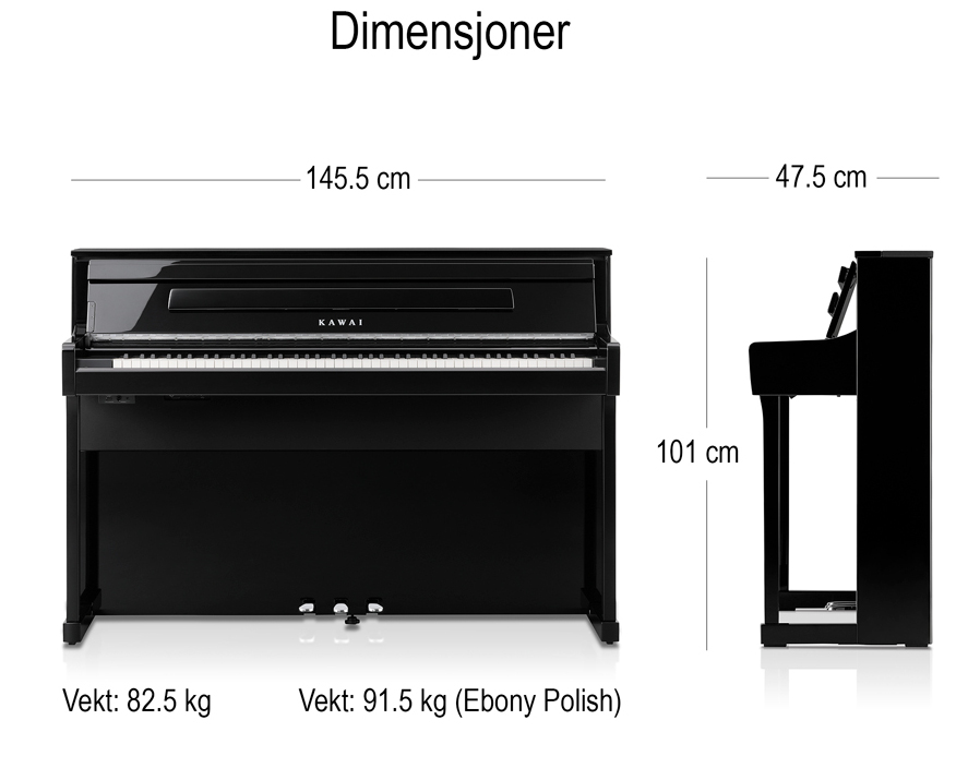 CA901 använder Kawai’s Grand Feel III mekanik med långa trätangenter och motvikter för att efterlikna känslan av ett akustiskt flygel. Innehåller två noggrant inspelade ljud från Shigeru Kawai SK-EX flyglar, inklusive den nya SK-EX Competition Grand. CA901 har avancerad ljudteknik och högtalarsystem med TwinDrive-resonansbotten för en rik och autentisk ljudupplevelse. Digitalpianot erbjuder Bluetooth® V5-anslutning, inbyggd metronom, lektionsfunktioner och en 5-tums LCD-pekskärm för enkel navigering.