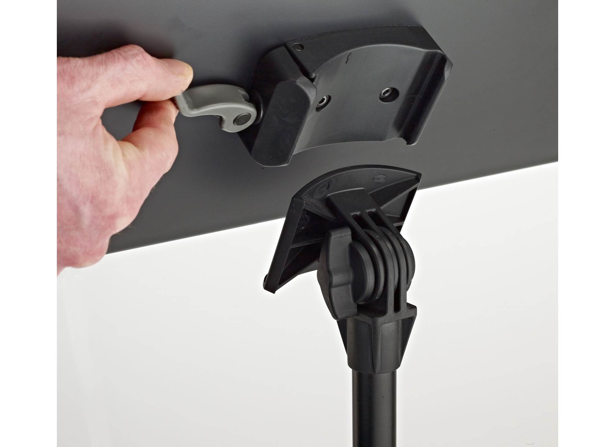 Pulverlackerad notställ i aluminium med stålplåt. Anslutningsdelar gjorda av slitstark plast. Musikbordet kan enkelt tas bort och fästas med sin användarvänliga och praktiska snabbkopplingsmekanism. En stor vingmutter gör det enkelt att justera vinkeln. Musikbordet kan justeras variabelt genom att klämma fast hylsor som skyddar ytan. 2-delad spökombination.