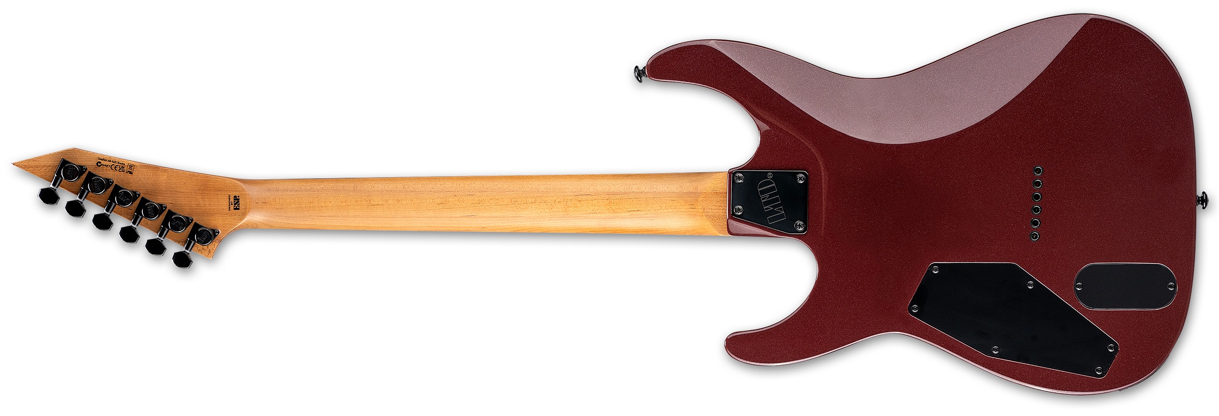 Elgitarr med bolt-on-konstruktion i 25,5” skala, mahognykropp och 3-delad roasted maple-hals med Extra Thin U-profil, rosewood-greppbräda med 24 extra-jumbo band, aktiva EMG 81/85-pickuper samt fast LTD hardtail-brygga med string-thru-body.