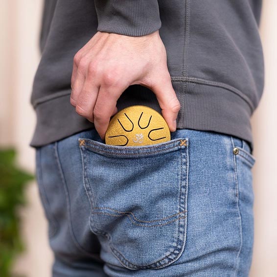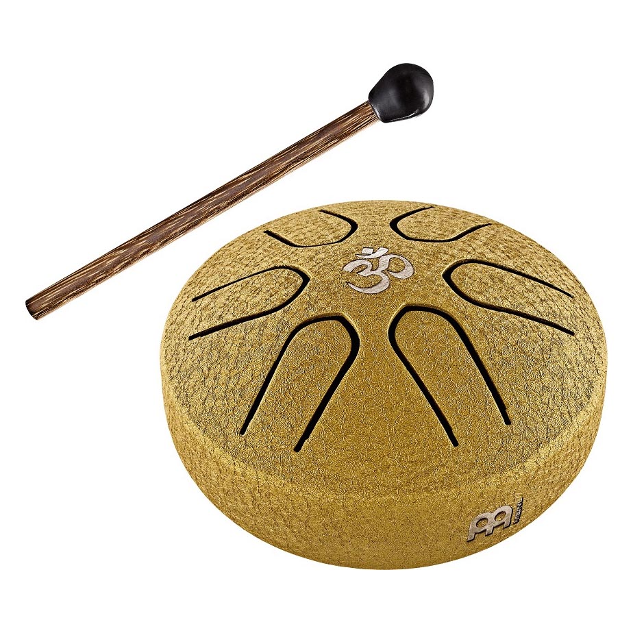 Kompakt steel tongue drum med 6 toner stämd i A-dur, tillverkad av rostfritt stål med guld-finish. Perfekt för musikälskare, lärare och ljudterapeuter. Levereras med en träklubba med gummihuvud.