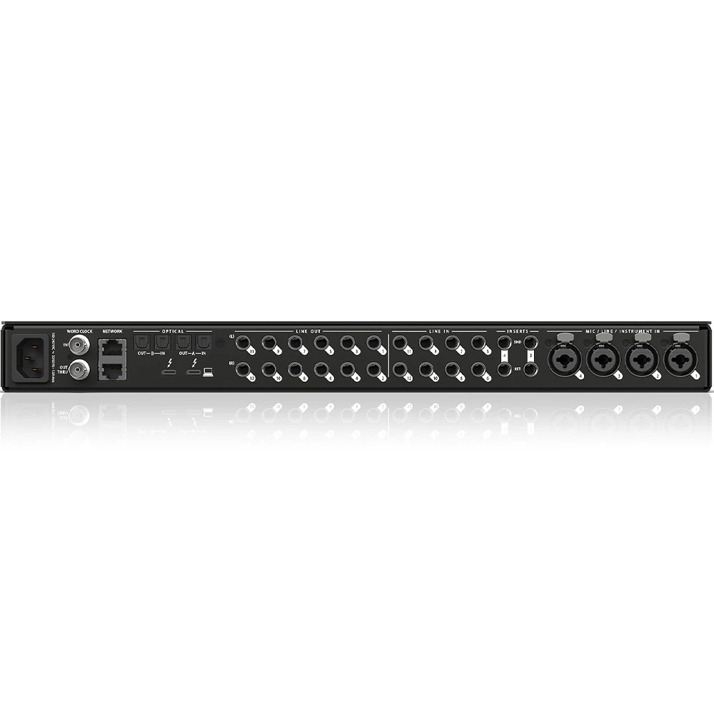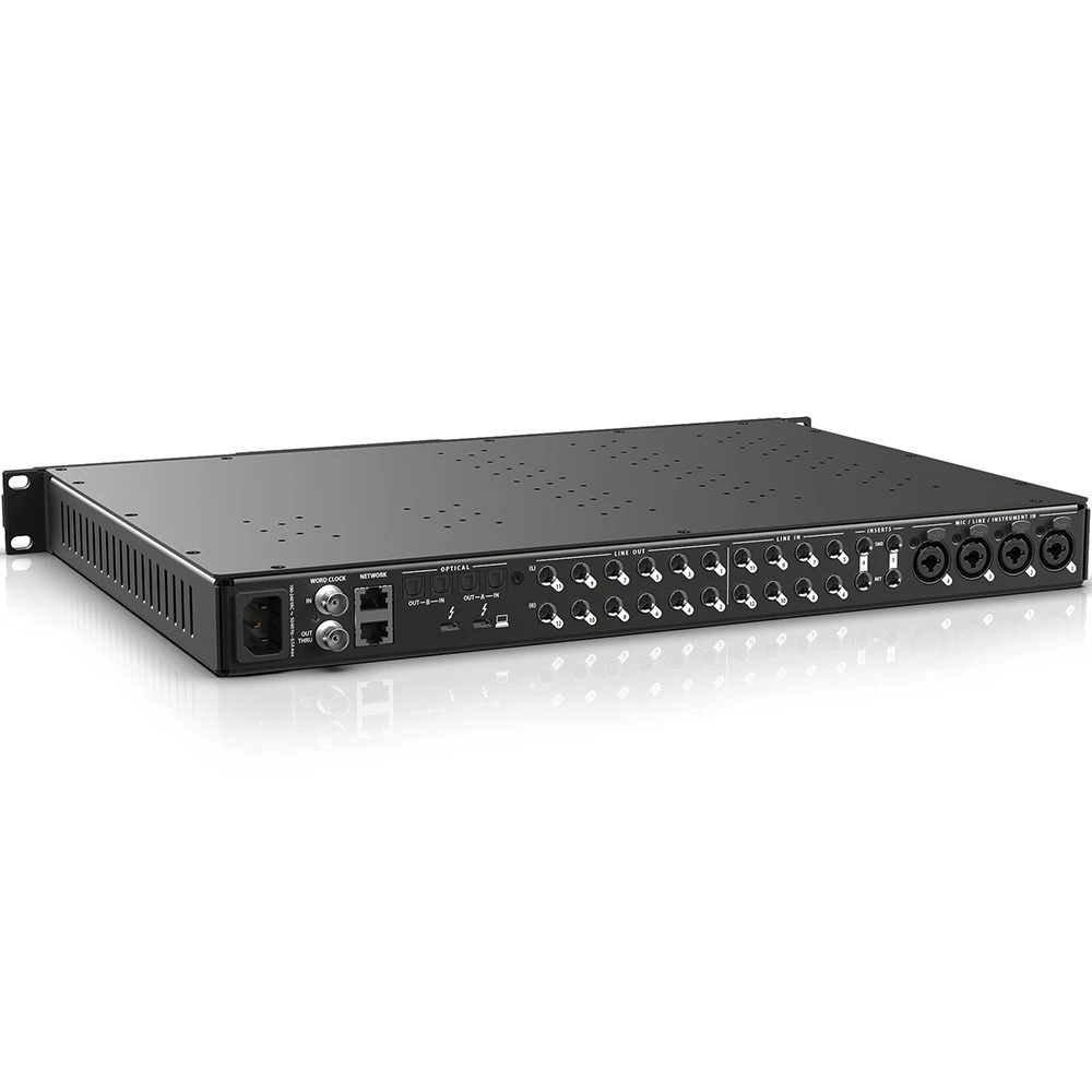 Professionellt Thunderbolt 4/USB4-ljudkort med 60 kanaler, ESS Sabre32 Ultra DAC, DSP-effekter och nätverksfunktioner för både studio och livescen.