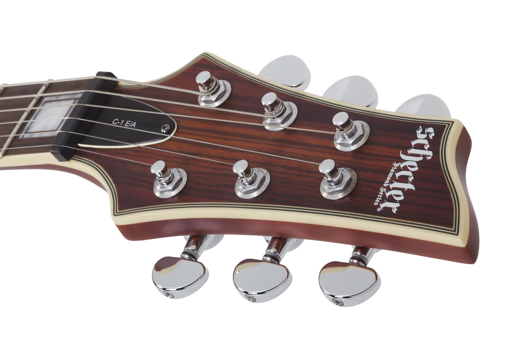 Schecter C-1 E/A Classic är en elgitarr med integrerat piezosystem och set-neck-konstruktion med Ultra Access. Kroppen är byggd i mahogany med arched top och topp i flamed maple, vilket kombinerar traditionell konstruktion med utökad elektronisk funktionalitet.